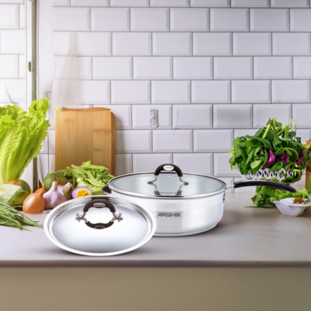 ماهیتابه استیل دو دسته عرشیا بههمراه دو درب (استیل و شیشهای) 30 سانتیمتر مدل SS014-3312