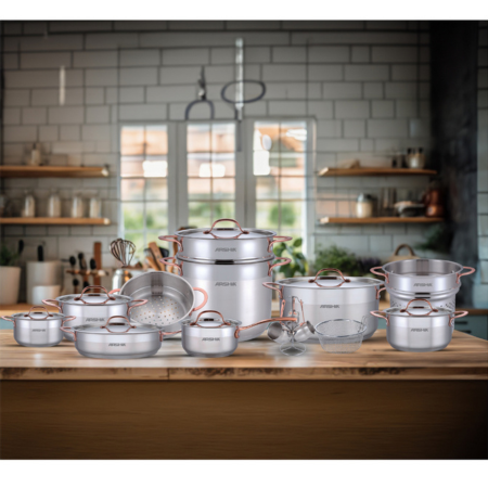با سرویس قابلمه استیل ۱۹ پارچه عرشیا مدل SS360-3278، آشپزی را در بالاترین سطح حرفهای تجربه کنید. این مجموعه با طراحی دقیق و کیفیت ممتاز، ترکیبی از دوام، زیبایی و عملکرد بینظیر را برای آشپزخانه شما فراهم میآورد. جنس تمام استیل ضدزنگ 18/10 همراه با دستههای مقاوم چدنی، تضمینکننده طول عمر بالا و انتقال یکنواخت حرارت در هنگام پخت است.