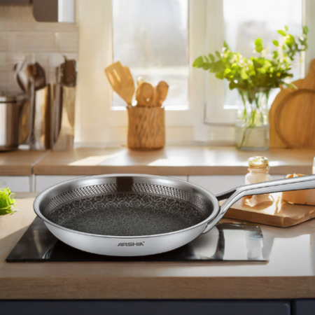ماهیتابه استیل عرشیا مدل SS050-3165 یکی از گزینههای حرفهای و بادوام برند Arshia است که برای آشپزی روزمره و پختهای حرفهای طراحی شده است. این تابه با ساختار سهلایه (Triply) شامل استیل ضدزنگ و هستهی آلومینیومی، حرارت را بهصورت یکنواخت در تمام سطح پخش میکند تا غذا بهطور کامل و یکنواخت بپزد.