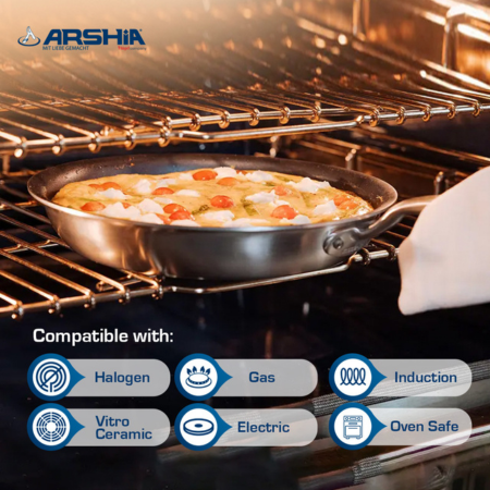 ماهیتابه عرشیا کاملاً فاقد مواد شیمیایی مضر (PFOA، PFOS، PTFE) است و سلامت شما و خانوادهتان را تضمین میکند. همچنین با تمام انواع اجاقها از جمله گازی، برقی، سرامیکی و القایی (Induction) سازگار است.