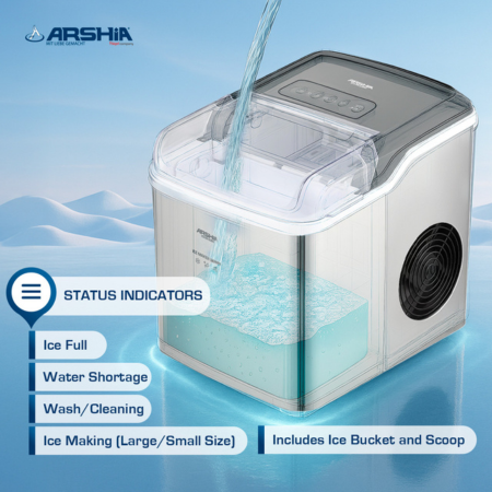 • پنل عملکرد چندگانه: شامل گزینه‌های یخ بزرگ، یخ کوچک، شست‌وشو/تمیزکاری، هشدار کمبود آب و پر شدن یخدان